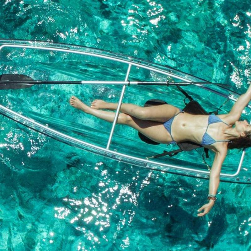 Experience the magic of paddling in a dream-like transparent canoe kayak that lets you and a partner immerse yourselves in the aquatic wonders without ever getting wet. This 11-foot marvel is made of polycarbonate Lexan, the same material that’s used for bulletproof glass and fighter jet canopies, so you know it can take a punchâas well as a splash! The transparent body offers a crystal-clear view of coral reefs, shimmering schools of fish, swaying seaweed, and maybe even a shark or two. Don’t worry, thoughâthe sturdy hull has your back (and your underside). Whether you’re navigating calm lakes for a romantic sunset paddle or exploring ocean adventures, this canoe offers the ultimate sightseeing setup.\n\nLight enough at 40 pounds to be carried by even the least gym-enthusiastic among us, this canoe is still impressively durable. It can haul up to 425 pounds, so bring your favorite personâor, you know, pack it full of snacks because why share, right? The anodized aluminum frame is completely removable, making it a breeze to store and transport to your next scenic destination.\n\nPerfect for anyone terrified of water but obsessed with aquatic life, this canoe lets you explore the depths from the safety of the surface. Aquaphobes and non-swimmers rejoiceâyou’re sealed in safety. Install it in minutes, disassemble it just as fast, and become the envy of every other paddler you pass. Or, humbly enjoy your undersea luxury yachtâyou do you.\n\nPacked and primed for lakeside getaways or adventurous vacations, the See Through Canoe is your go-to craft for unbelievable sightseeing and unparalleled fun. Paddle upward and onward with views that make Instagram jealous and memories you’ll brag about for years.